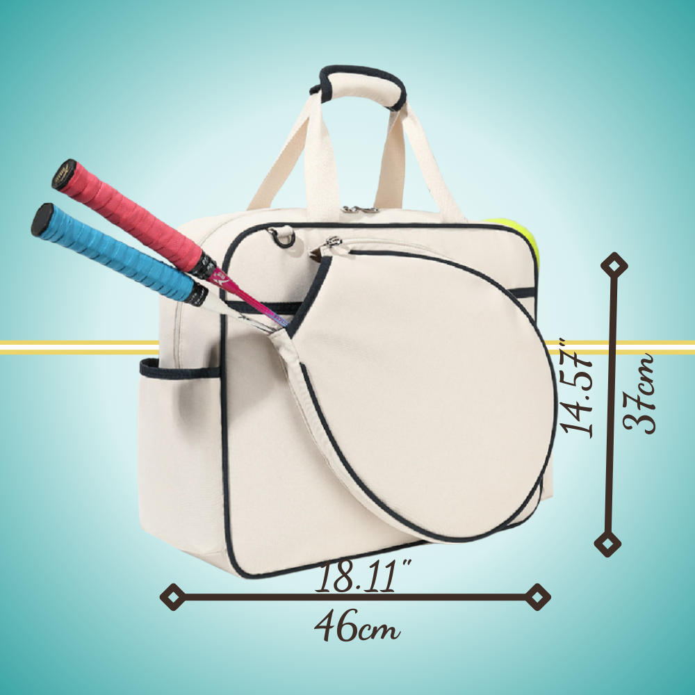 Introducing the best tennis bag for women, where sophistication and practicality unite. This exquisite ladie's tennis tote bag is designed to complement the modern player's lifestyle, offering unmatched versatility and elegance. Crafted from premium materials, this canvas tennis bag effortlessly transitions from a stylish tennis tote bag to a functional racket bag, elevating your game from the first serve to forever passion.